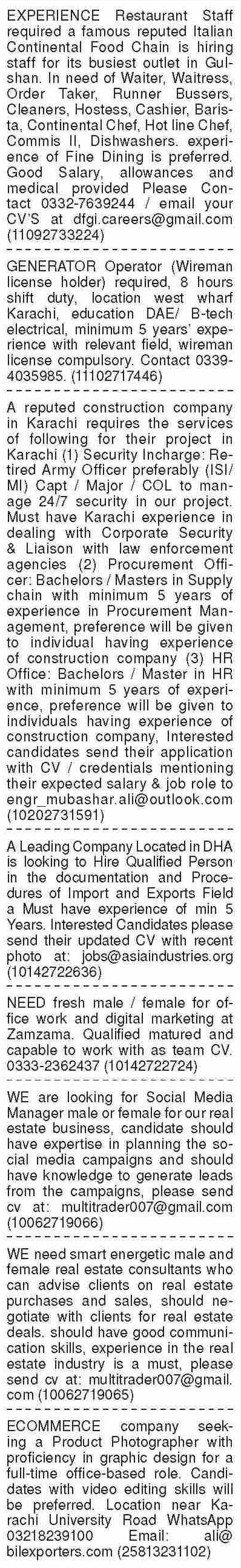 Private Company jobs advertisement dated about 25 March 2024 in daily Dawn Newspaper invites application for the vacant post of waiter, social media manager, hr officer, import officer, wireman, export officer, cashier, barista, waitress, runner, cleaner, continental chef, generator operator, real estate consultant, order taker, hostess, busser, commis, chef, restaurant staff, procurement officer, security incharge, digital marketing officer and dishwasher in Karachi, karachi Sindh Pakistan. Persons with Intermediate, Bachelor, MS, Middle, Matric, Master and BA etc. education can apply.
