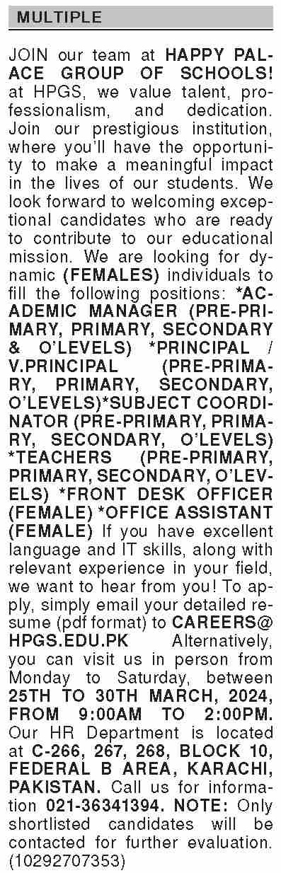 Happy Palace Group of Schools invites applications for job positions advertised in daily Dawn dated 25 March 2024 for following vacancies in Karachi, karachi Sindh Pakistan.
