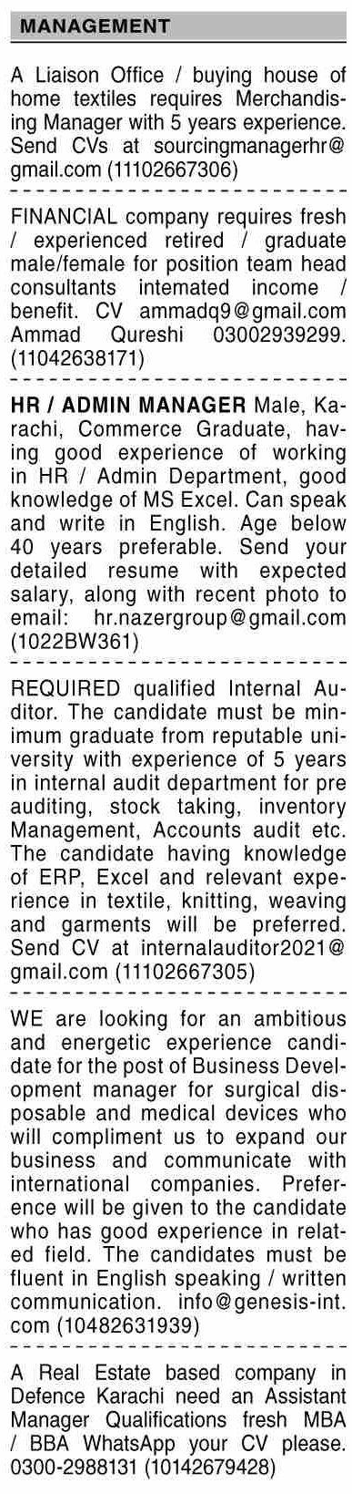 Manager, Admin Manager, Assistant Manager, Accounts Manager, Export Manager, Import Manager, SPA Manager, Garments Manager, Merchandiser, Accountant, Assistant Accounts Manager, Accounts Officer, Finance Manager, Sales Manager, Marketing Manager, Executive Manager, Branch Manager, Secretary, Security Guard, Driver seeks in well progressive companies.