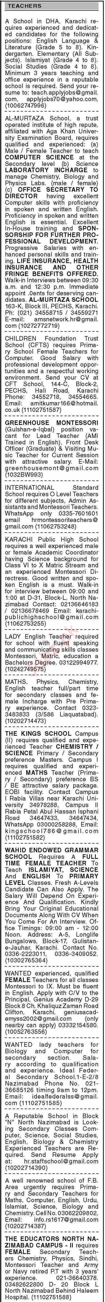 Private School Karachi, karachi Sindh Pakistan invites applications from eligible candidates for the post of front desk officer, computer teacher, primary teacher, pt teacher, maths teacher, teacher, o level teacher, chemistry teacher, pti, office secretary, urdu teacher, admin assistant, music teacher, english literature teacher, islamiyat teacher, academic coordinator, sindhi teacher, social studies teacher, biology teacher, laboratory incharge, montessori teacher, english teacher, female teacher, directress montessori, physics teacher and english language teacher as per advertisement of September 25, 2023 published in daily Dawn Newspaper. B.ed, MS, Intermediate, Master, BA, M.sc, Bachelor, MA and M.ed etc. educational qualification will be preferred.