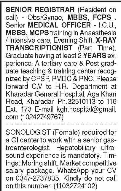 Hospital Clinic jobs advertisement dated about 26 February 2024 in daily Dawn Newspaper invites application for the vacant post of gastroenterologist, anaesthesia specialist, sonologist, registrar, medical officer, mbbs doctor, fcps doctor, mcps doctor and x ray transcriptionist in Karachi, karachi Sindh Pakistan. Candidates with Bachelor, Matric, Intermediate, Others, P.G Diploma, DAE and MBBS etc. educational background will be preferred.