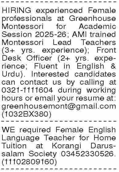 Private School Korangi Karachi, karachi Sindh Pakistan invites applications from eligible candidates for the post of english language teacher, montessori lead teacher, teacher and front desk officer as per advertisement of May 26, 2025 published in daily Dawn Newspaper. Educational qualifications required Master, MA, M.sc and Bachelor etc.