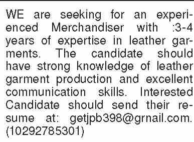 Leather Garments Company jobs advertisement dated about 27 January 2025 in daily Dawn Newspaper invites application for the vacant post of merchandiser and leather merchandiser in Karachi, karachi Sindh Pakistan. Persons with Intermediate and Bachelor etc. education can apply.