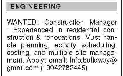 Vacant posts including construction manager are announced in Construction Company Karachi, karachi Sindh Pakistan as per 27 October 2025 advertisement in daily Dawn Newspaper. Educational qualifications required Bachelor, Intermediate and DAE etc.