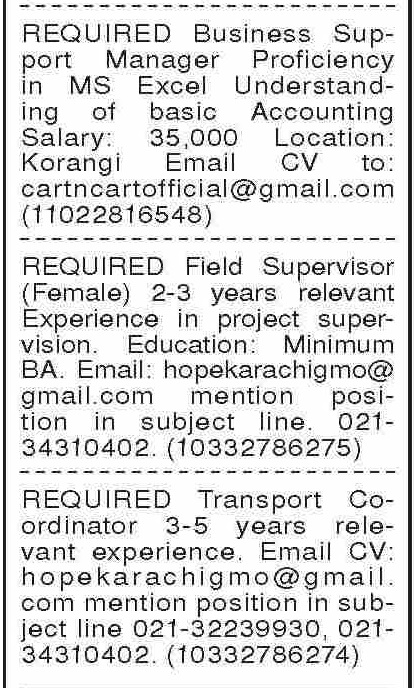 Private Company jobs advertisement dated about 28 April 2025 in daily Dawn Newspaper invites application for the vacant post of field supervisor, business support manager and transport coordinator in Karachi, karachi Sindh Pakistan. Bachelor, Intermediate, B.com, BA and Others etc. educational qualification will be preferred.