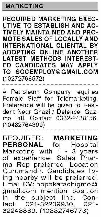 Marketing Company Karachi, karachi Sindh Pakistan invites applications from eligible candidates for the post of marketing personal, telemarketing officer and marketing executive as per advertisement of August 28, 2023 published in daily Dawn Newspaper. MBA, BBA, ACCA, Bachelor and B.com etc. educational qualification will be preferred.
