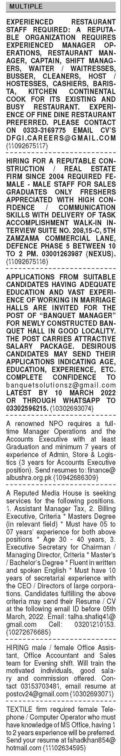 Dawn Sunday Classified Ads 27 Feb 2022 For Multiple Staff