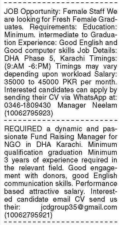 Private Company DHA Phase 5 Karachi, karachi Sindh Pakistan invites applications from eligible candidates for the post of office staff, female office staff and fund raising manager as per advertisement of July 28, 2025 published in daily Dawn Newspaper. Educational qualifications required BA, Bachelor, Others, Intermediate and B.com etc.