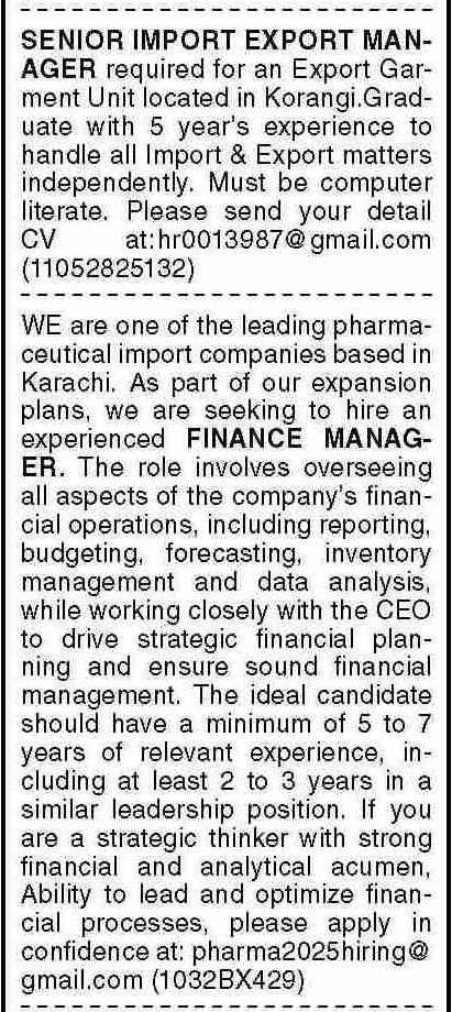 Private Company invites applications for job positions advertised in daily Dawn dated 28 July 2025 for following vacancies in Korangi Karachi, karachi Sindh Pakistan.