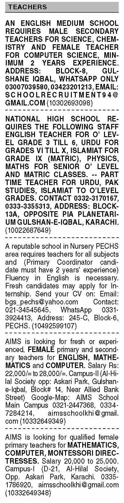 Dawn Sunday Classified Ads 27 March 2022 for Teachers