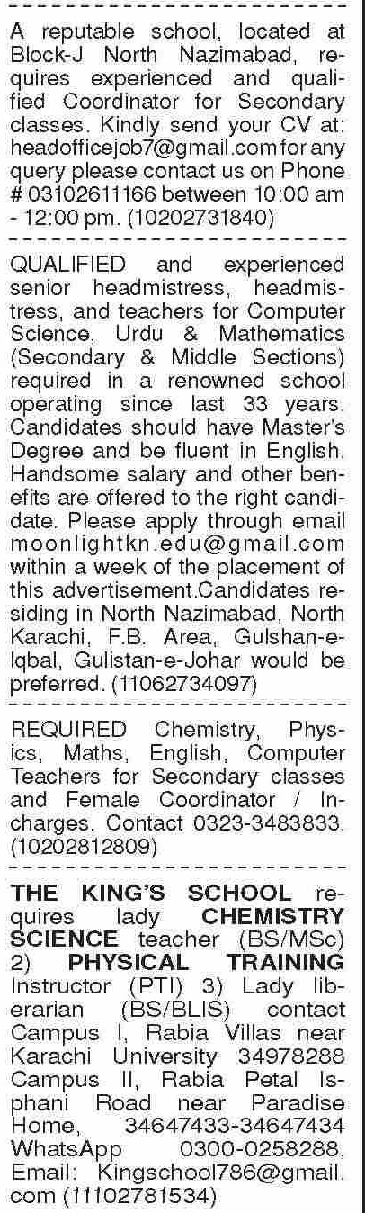 Private School Karachi, karachi Sindh Pakistan invites applications from eligible candidates for the post of lady teacher, chemistry teacher, headmistress, coordinator, physics teacher, maths teacher, urdu teacher, computer science teacher, teacher and mathematics teacher as per advertisement of October 28, 2024 published in daily Dawn Newspaper. Educational qualifications required Bachelor, BA, M.sc, B.ed, MA and Master etc.