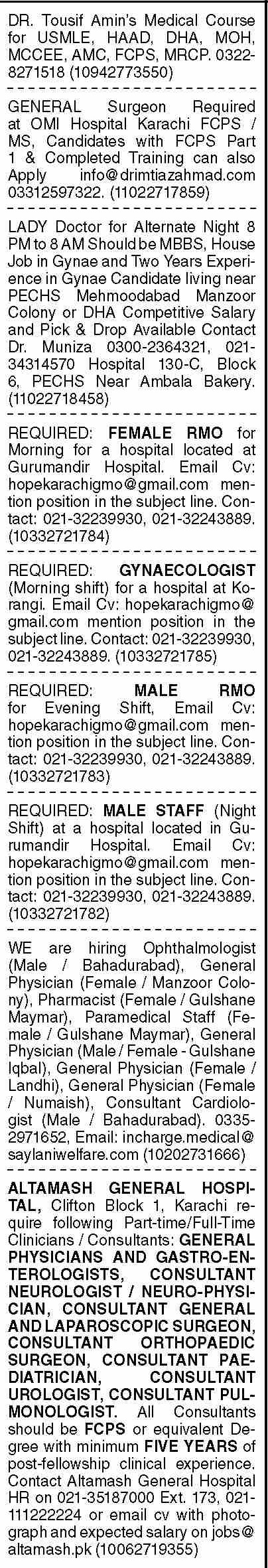 Hospital Clinic is looking for candidates for following posts as per job advertisement published in daily Dawn Newspaper of April 28, 2024 for location Karachi, karachi Sindh Pakistan: