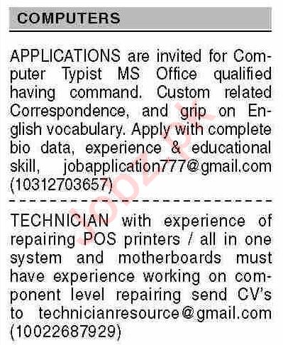 IT Company Karachi, karachi Sindh Pakistan invites applications from eligible candidates for the post of computer typist, typist and technician as per advertisement of August 29, 2022 published in daily Dawn Newspaper. Matric, Bachelor and Intermediate etc. educational qualification will be preferred.