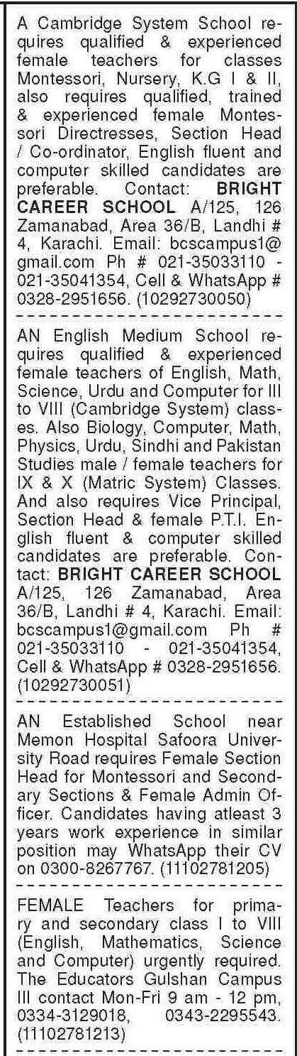 Private School invites applications for job positions advertised in daily Dawn dated 29 July 2024 for following vacancies in Karachi, karachi Sindh Pakistan.