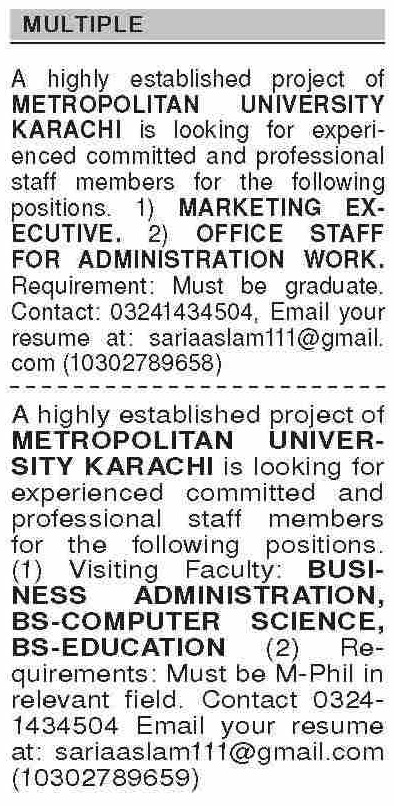Metropolitan University is looking for candidates for following posts as per job advertisement published in daily Dawn Newspaper of July 29, 2024 for location Karachi, karachi Sindh Pakistan: