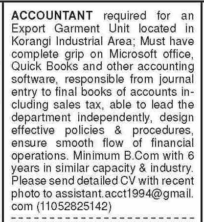 Garments Factory Korangi Industrial Area Karachi, karachi Sindh Pakistan invites applications from eligible candidates for the post of accountant and accounts officer as per advertisement of September 29, 2025 published in daily Dawn Newspaper. Preferred Education is B.com and Bachelor etc.
