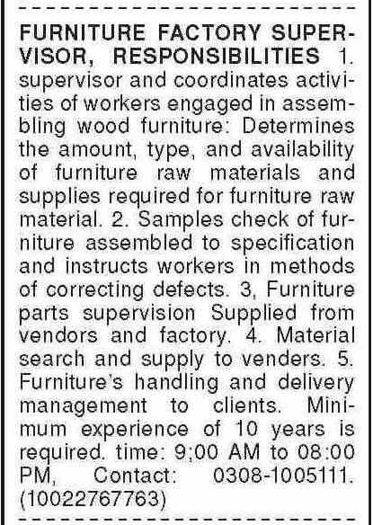 Furniture Factory is looking for candidates for following posts as per job advertisement published in daily Dawn Newspaper of September 29, 2025 for location Karachi, karachi Sindh Pakistan:
