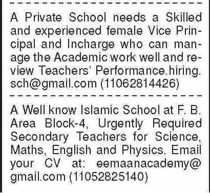 Private School is looking for candidates for following posts as per job advertisement published in daily Dawn Newspaper of September 29, 2025 for location Federal B Area - Block 4 Karachi, karachi Sindh Pakistan: