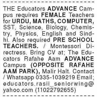 Vacant posts including teacher, sindh teacher, biology teacher, english teacher, computer teacher, social study teacher, chemistry teacher, montessori directress, physics teacher, preschool teacher, maths teacher, urdu teacher, science teacher and female teacher are announced in The Educators Malir Halt Karachi, karachi Sindh Pakistan as per 29 September 2025 advertisement in daily Dawn Newspaper. Candidates with MA, M.sc, Bachelor, Others, Master and BA etc. educational background will be preferred.