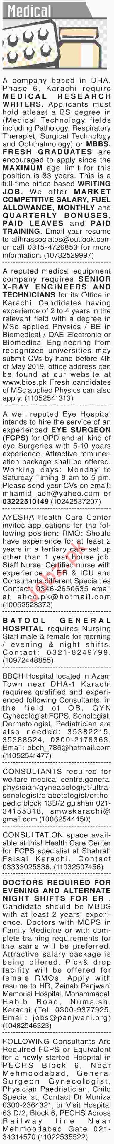 Skin Specialist, Medical Specialist, ENT Specialist, Eye Specialist, Child Specialist, Medical Officer, Radiologist, Nurse, LHV, Doctor, Lady Doctor, Pharmacist, Midwives, Gynecologist, Receptionist, Dispenser, Resident Medical Officer, Pathologist, General Manager, Admin Assistant, Executive Officer, Manager Housekeeping, Assistant Chemist, ICU Technician, CT Scan Technician seeks in well reputed companies.