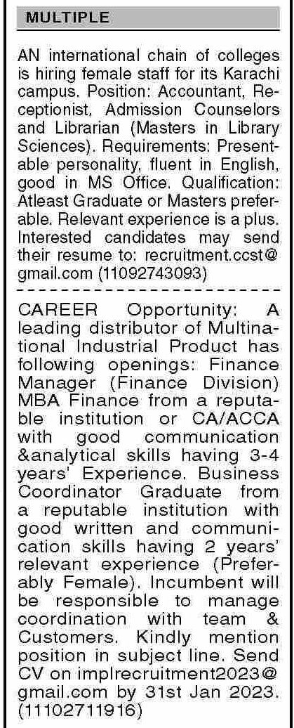 Private Company invites applications for job positions advertised in daily Dawn dated 30 January 2023 for following vacancies in Karachi, karachi Sindh Pakistan.
