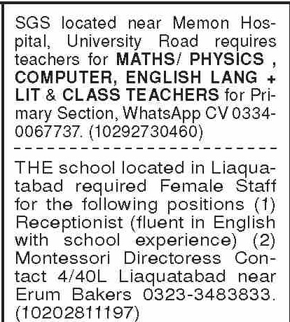 Private School invites applications for job positions advertised in daily Dawn dated 30 June 2025 for following vacancies in Liaquatabad Karachi, karachi Sindh Pakistan.