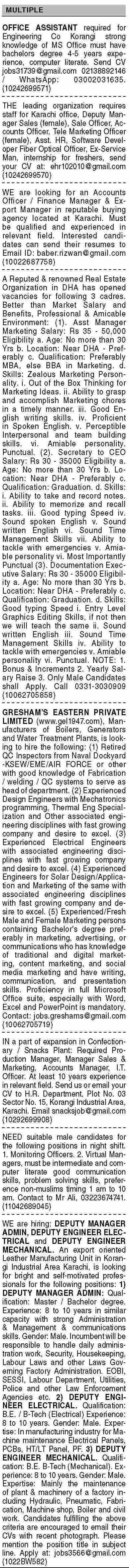 Private Company jobs advertisement dated about 30 May 2022 in daily Dawn Newspaper invites application for the vacant post of deputy manager admin, manager marketing, deputy engineer electrical, production manager, software developer, assistant manager marketing, assistant hr, welder, accounts manager, manager sales, fiber optical officer, qc inspector, deputy manager mechanical, office assistant, deputy manager sales, it officer, accounts officer, export manager, finance manager, documentation executive, virtual manager, telemarketing officer, secretary, monitoring officer and sales offier in Karachi, karachi Sindh Pakistan. Intermediate, Bachelor, Matric and Middle etc. educational qualification will be preferred.