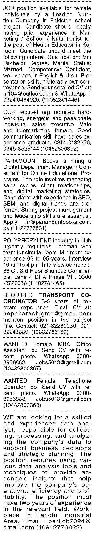 Private Company invites applications for job positions advertised in daily Dawn dated 30 September 2024 for following vacancies in Karachi, hub and karachi Sindh Pakistan.
