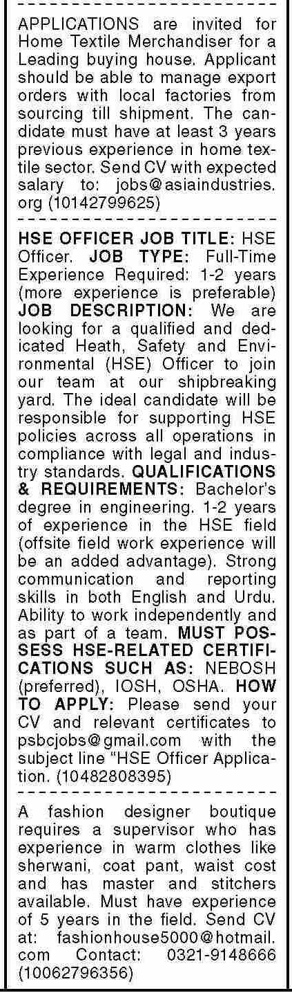 Private Company jobs advertisement dated about 4 August 2025 in daily Dawn Newspaper invites application for the vacant post of hse officer, merchandiser, home textile merchandiser and fashion designer in Karachi, karachi Sindh Pakistan. Candidates with Bachelor, DAE, Others and Intermediate etc. educational background will be preferred.
