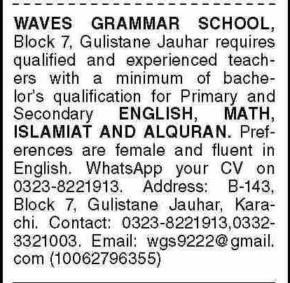 Waves Grammar School is looking for candidates for following posts as per job advertisement published in daily Dawn Newspaper of August 4, 2025 for location Gulistan-e-Jauhar Block 7 Karachi, karachi Sindh Pakistan: