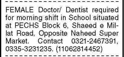 Private School jobs advertisement dated about 4 August 2025 in daily Dawn Newspaper invites application for the vacant post of doctor, female doctor and dentist in PECHS Block 6 Karachi, karachi Sindh Pakistan. Preferred Education is MBBS, Others and BDS etc.