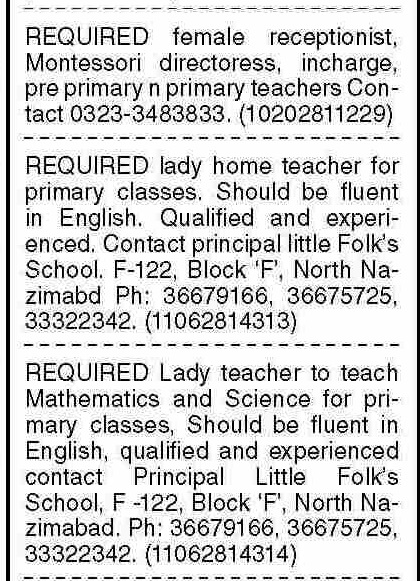 Little Folks Paradise School invites applications for job positions advertised in daily Dawn dated 4 August 2025 for following vacancies in North Nazimabad - Block F Karachi, karachi Sindh Pakistan.