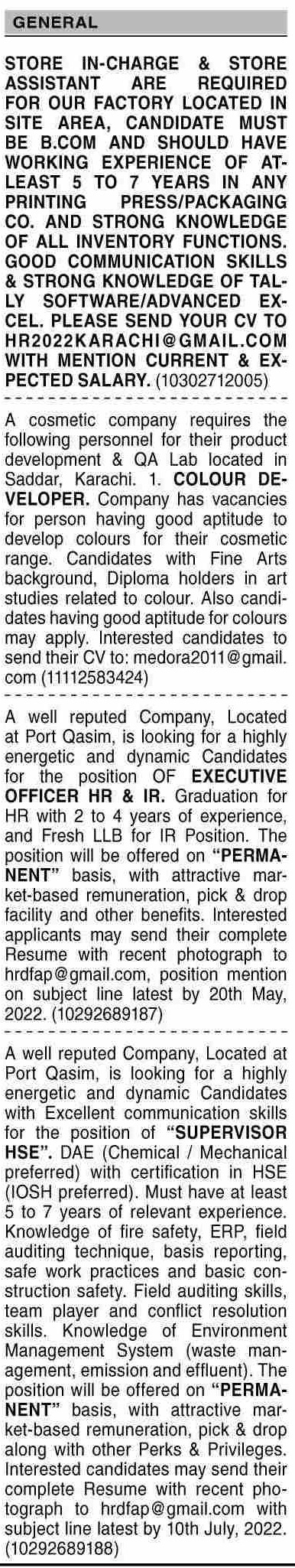 Private Company Karachi, karachi Sindh Pakistan invites applications from eligible candidates for the post of supervisor hse, colour developer, store incharge, store assistant, executive officer ir and executive officer hr as per advertisement of July 4, 2022 published in daily Dawn Newspaper. Candidates with Intermediate, Matric, Middle and Bachelor etc. educational background will be preferred.
