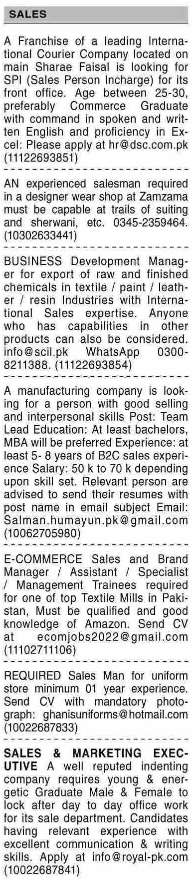 Vacant posts including sales executive, business development manager, sales assistant, sales person incharge, salesman, sales staff, sales specialist, marketing executive, assistant, sales manager, team lead, brand manager and management trainee are announced in Marketing Company Karachi, karachi Sindh Pakistan as per 4 July 2022 advertisement in daily Dawn Newspaper. Educational qualifications required Middle, Matric, Bachelor and Intermediate etc.
