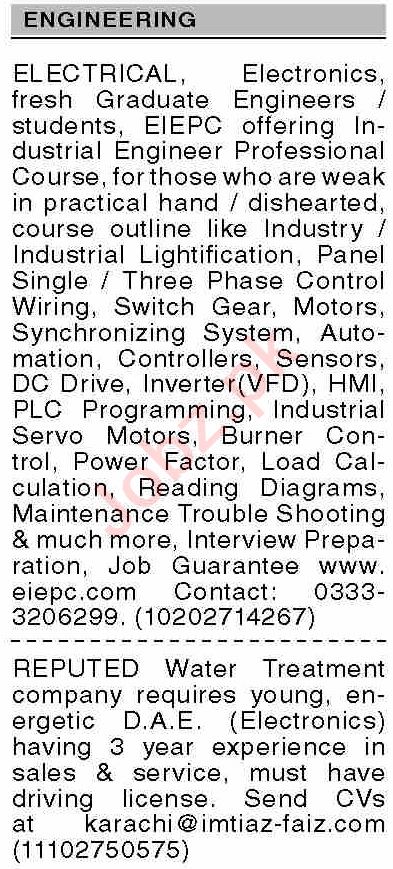 Engineering Company Karachi, karachi Sindh Pakistan invites applications from eligible candidates for the post of electronics technician, electronics engineer, industrial engineer, engineer and electrical engineer as per advertisement of May 1, 2023 published in daily Dawn Newspaper. Persons with B.E, Bachelor, DAE and Intermediate etc. education can apply.