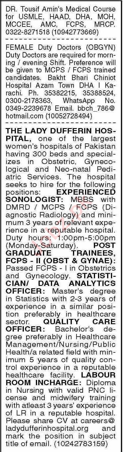 Hospital Clinic is looking for candidates for following posts as per job advertisement published in daily Dawn Newspaper of July 1, 2024 for location Karachi, karachi Sindh Pakistan: