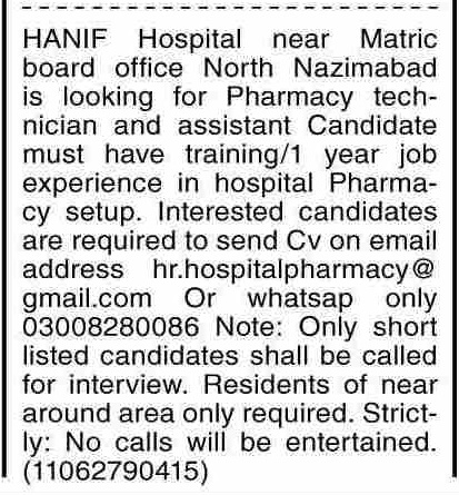 Hanif Hospital jobs advertisement dated about 1 December 2025 in daily Dawn Newspaper invites application for the vacant post of pharmacy assistant and pharmacy technician in North Nazimabad Karachi, karachi Sindh Pakistan. Bachelor, B Pharmacy and Intermediate etc. educational qualification will be preferred.