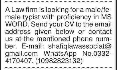Vacant posts including typist and office staff are announced in Law Firm Karachi, karachi Sindh Pakistan as per 1 September 2025 advertisement in daily Dawn Newspaper. Candidates with Intermediate and Bachelor etc. educational background will be preferred.
