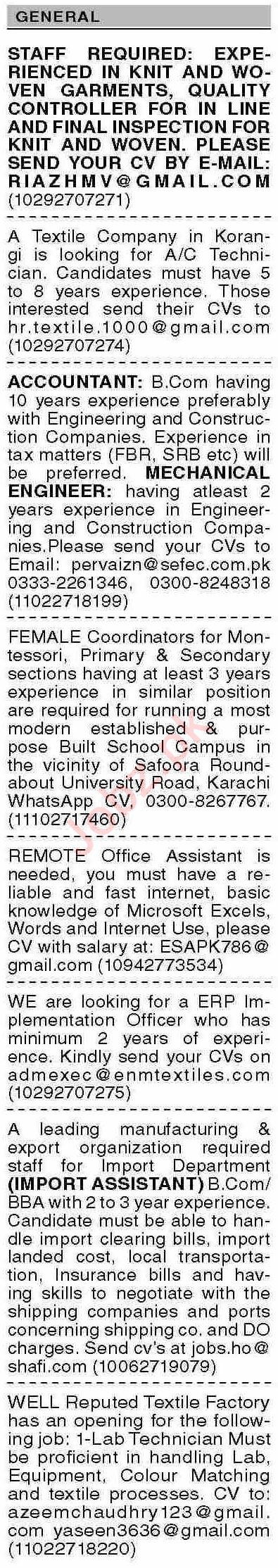 Private Company jobs advertisement dated about 1 April 2024 in daily Dawn Newspaper invites application for the vacant post of lab technician, accountant, office assistant, mechanical engineer, female coordinator, ac technician, erp implementation officer, import assistant and quality controller in Karachi, karachi Sindh Pakistan. DAE, BBA, B.E, Matric, B.com, Bachelor and Intermediate etc. educational qualification will be preferred.