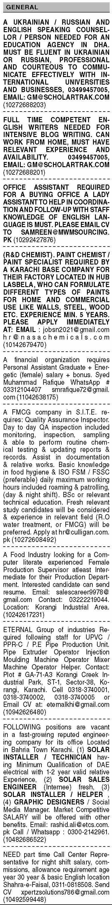 Dawn Sunday Classified Ads 31 Oct 2021 For General Staff
