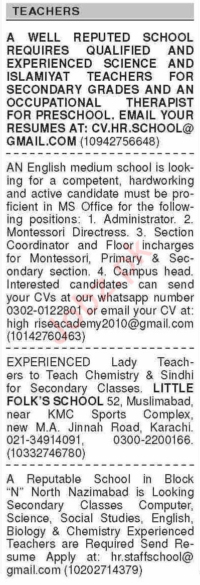 Private School is looking for candidates for following posts as per job advertisement published in daily Dawn Newspaper of September 4, 2023 for location Karachi, karachi Sindh Pakistan: