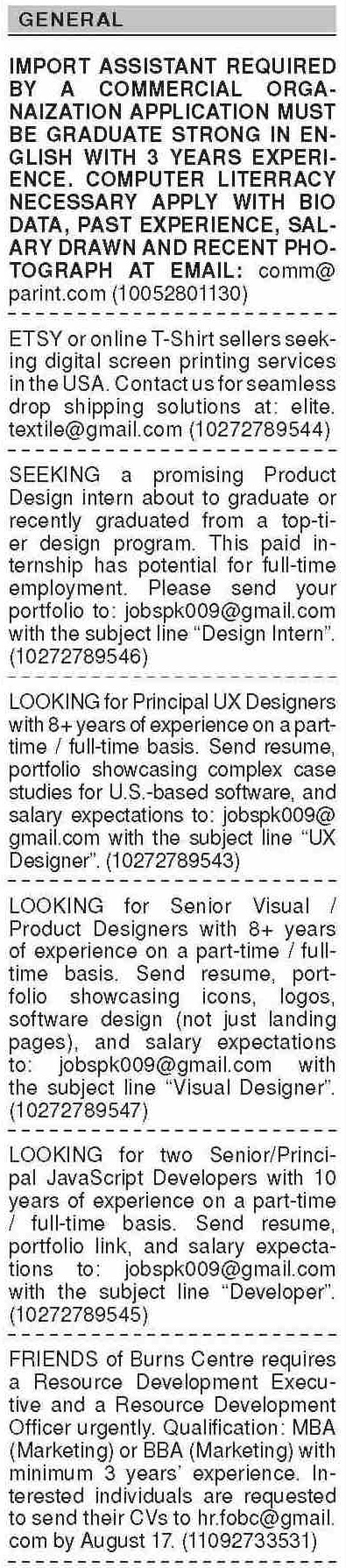 Latest Classifieds jobs in Private Company in Executive and others can be applied till 20 August 2024 or as per closing date in newspaper ad. Read complete ad online to know how to apply on latest Private Company job opportunities. Some jobs in Private Company may require skills like UX / User Experience, Visual Design, Javascript and Business Development.