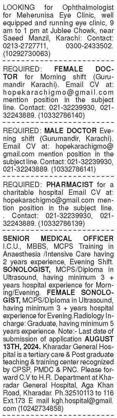 Hospital Clinic is looking for candidates for following posts as per job advertisement published in daily Dawn Newspaper of August 5, 2024 for location Karachi, karachi Sindh Pakistan: