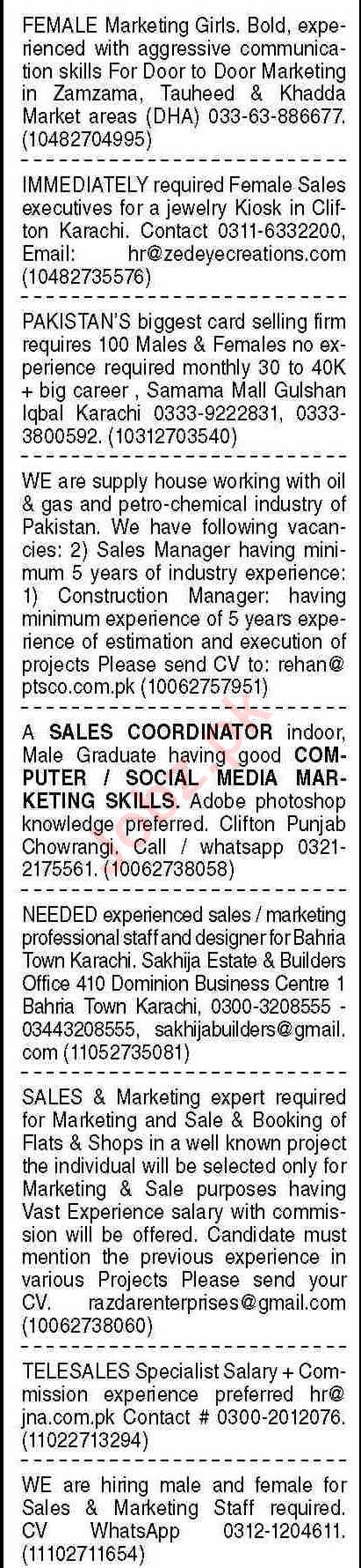 Marketing Company invites applications for job positions advertised in daily Dawn dated 5 December 2022 for following vacancies in Karachi, karachi Sindh Pakistan.