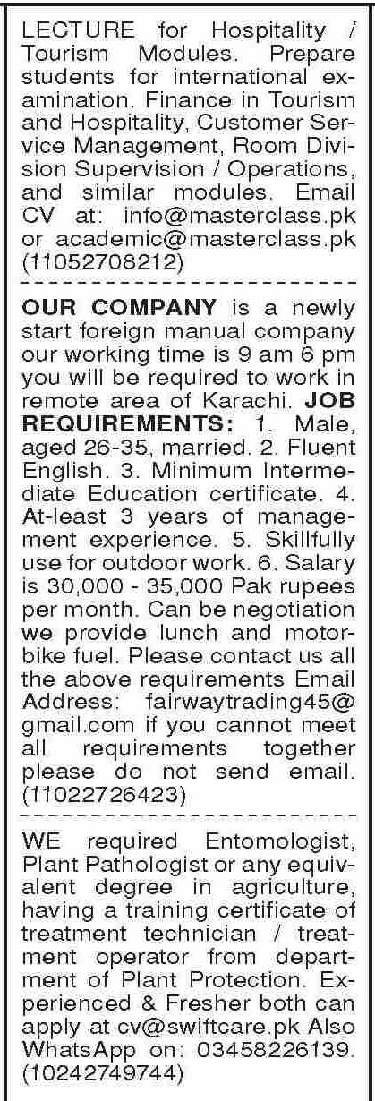 Private Company is looking for candidates for following posts as per job advertisement published in daily Dawn Newspaper of February 5, 2024 for location Karachi, karachi Sindh Pakistan: