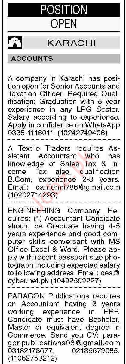 Private Company jobs advertisement dated about 5 June 2023 in daily Dawn Newspaper invites application for the vacant post of accounts officer, assistant accountant, taxation officer and accountant in Karachi, karachi Sindh Pakistan. Educational qualifications required M.com, Bachelor, B.com, MBA, BBA and ACCA etc.