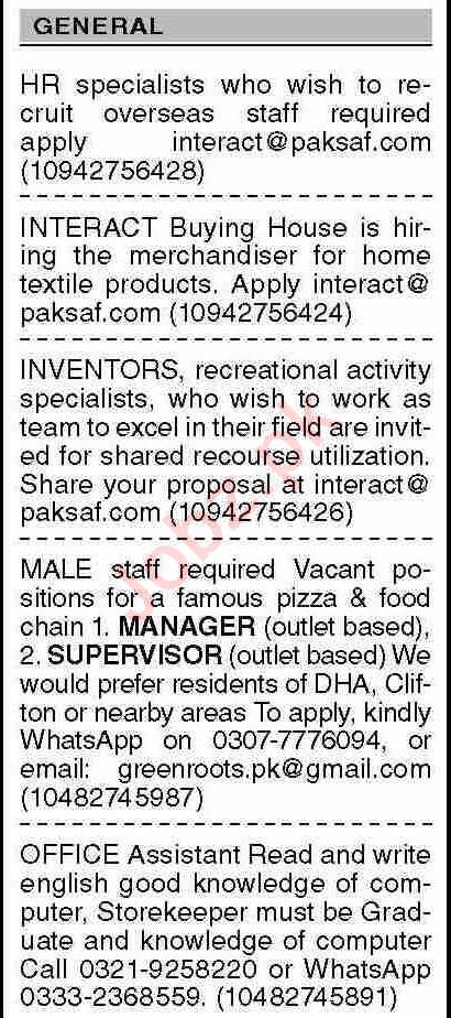Private Company Karachi, karachi Sindh Pakistan invites applications from eligible candidates for the post of office assistant, supervisor, hr specialist, merchandiser, activity specialist, manager and inventor as per advertisement of June 5, 2023 published in daily Dawn Newspaper. Preferred Education is BA, B.com, Bachelor, BBA, Intermediate and Matric etc.