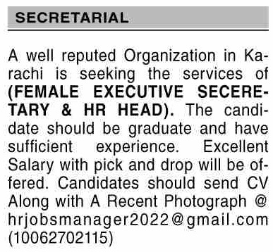 Vacant posts including female executive secretary and secretary are announced in Private Company Karachi, karachi Sindh Pakistan as per 6 June 2022 advertisement in daily Dawn Newspaper. Intermediate and Bachelor etc. educational qualification will be preferred.
