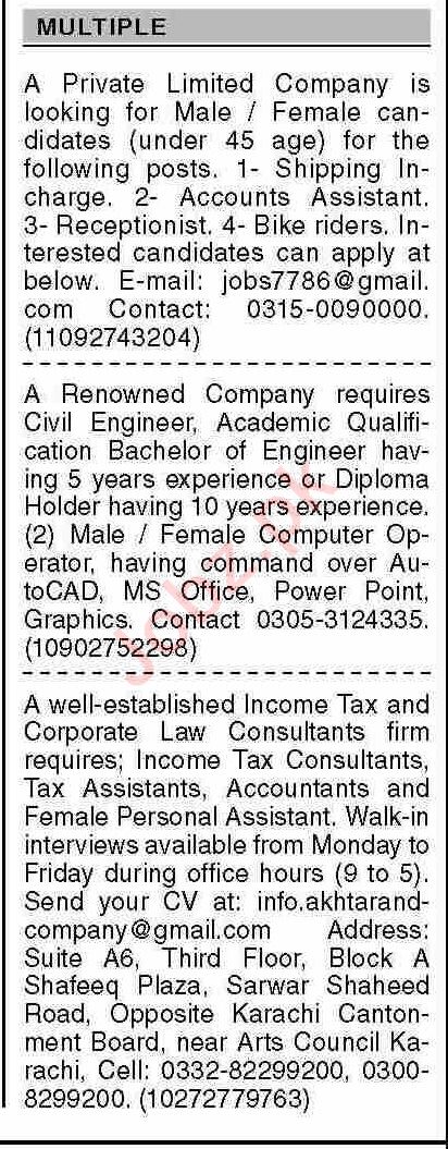 Private Company invites applications for job positions advertised in daily Dawn dated 6 March 2023 for following vacancies in Karachi, karachi Sindh Pakistan.