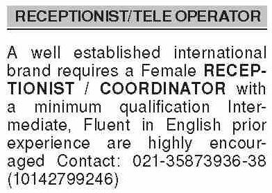 Dawn Sunday Classified Ads 5 May 2024 for Receptionist